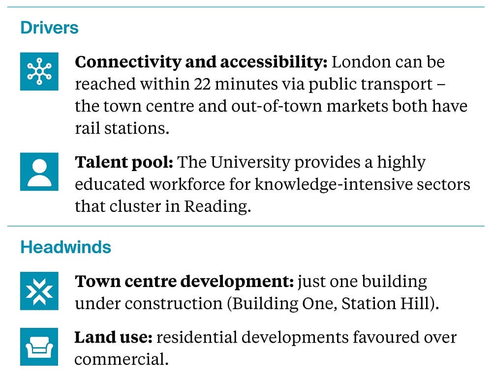 Reading offers highly connected, amenity-rich office space and a highly qualified talent pool for occupiers. For investors and developers, it provides an opportunity for attractive returns via rental growth and the demand for additional office stock.