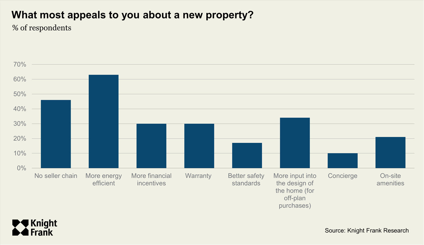 These were the three factors highlighted as being the most appealing about new build homes, according to Knight Frank’s latest sentiment survey of over 300 individuals based in the UK.