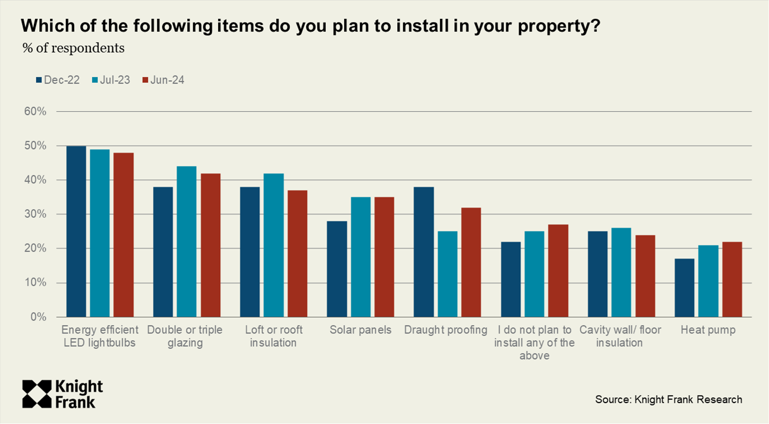 If they do, the most popular choices trend towards the lower cost or easier to install items such as energy efficient LED lightbulbs (half of respondents), double or triple glazing (40%), and loft insulation (just under 40%).