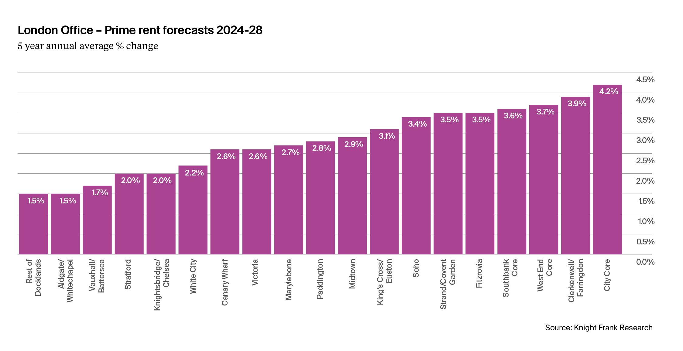 Over the next five years, we expect the strongest average annual growth in the City and Southbank to be in the City Core (4.2%), Clerkenwell/ Farringdon (3.9%), and Southbank Core (3.6%). In the West End, we expect the highest growth in prime rents in the West End Core (3.7%), Fitzrovia (3.5%) and Strand/Covent Garden (3.5%).