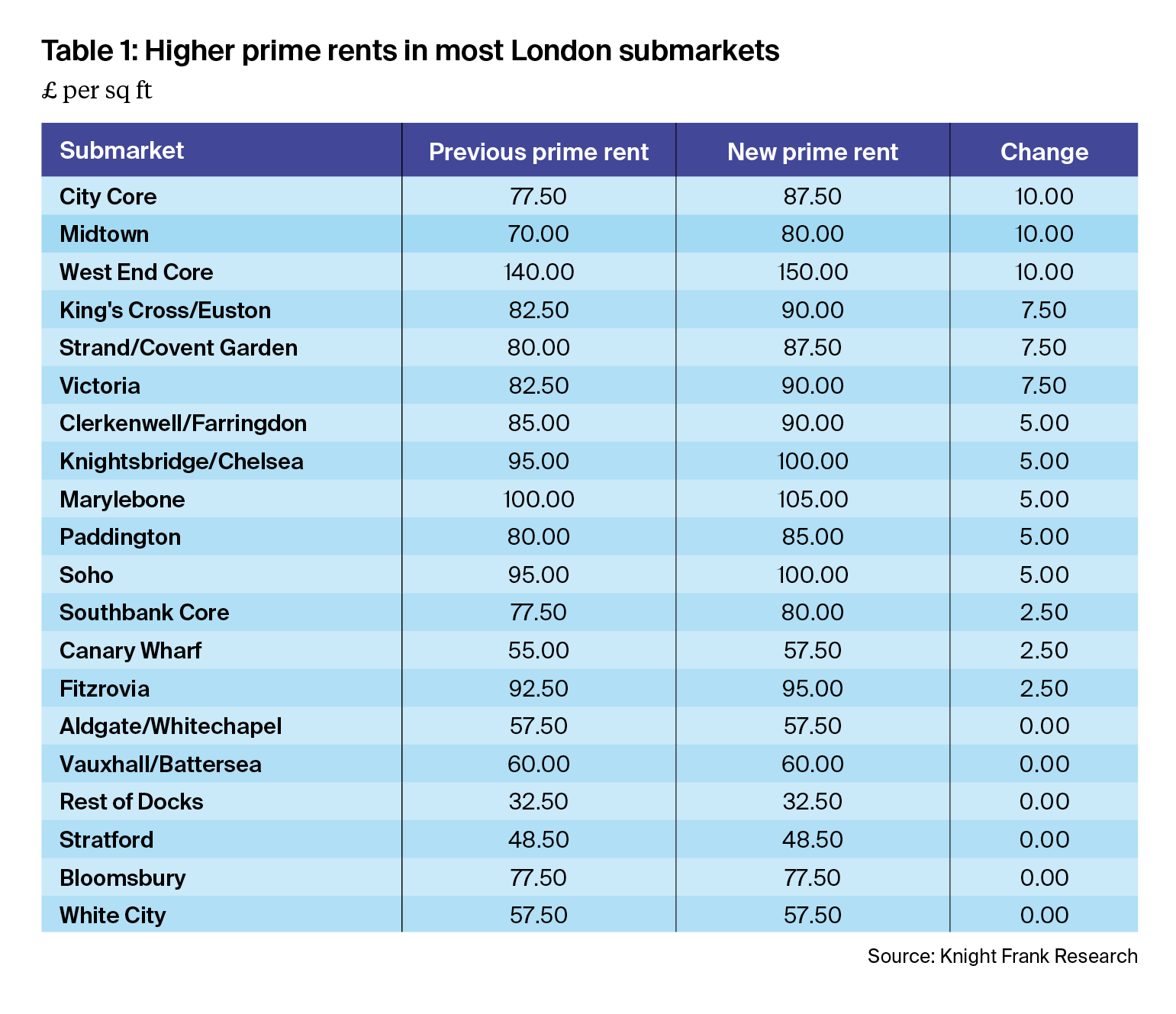 Table 1 shows the impact on rents from applying this adjustment to our basket of prime transactions. It shows higher prime rents in many of London submarkets and the most significant uplifts in many business districts. From £77.50 to £87.50 per sq ft in the City Core, from £70.00 to £80.00 per sq ft in Midtown and from £140 to £150 per sq ft in West End Core.