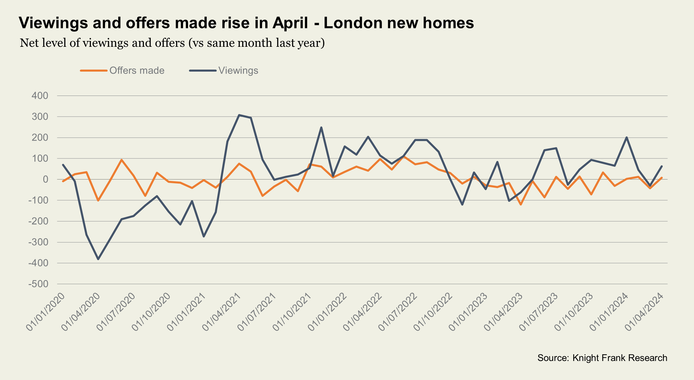 In April, the total number of offers made on new homes in the capital rose 9% compared with a year earlier, while viewings were up 17%, Knight Frank data shows. In early 2024, the net volume of viewings and offers made has largely been positive against 2023, other than a dip in March when inflation rose at a stronger rate than expected (see chart).