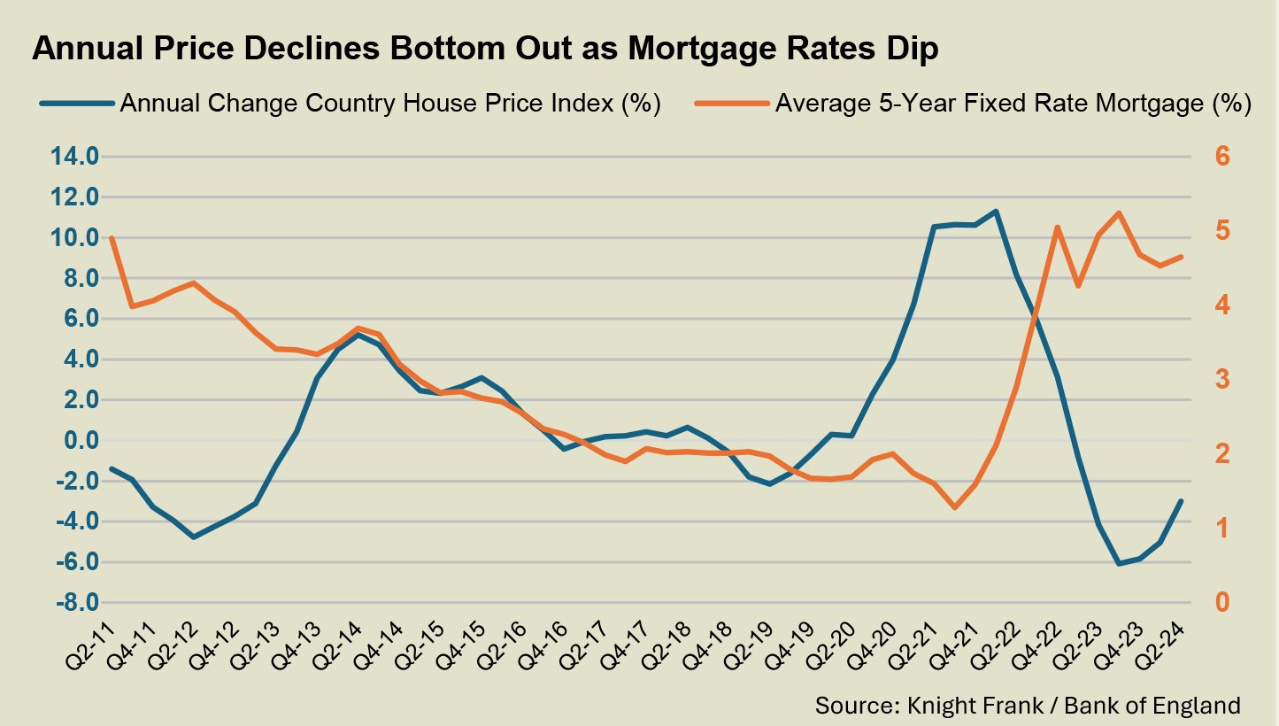 Average prices in Country markets fell by 3% in the year to Q2 2024, which was the narrowest decline since Q1 2023 and underlines how demand has strengthened as borrowing costs have fallen (see chart above).