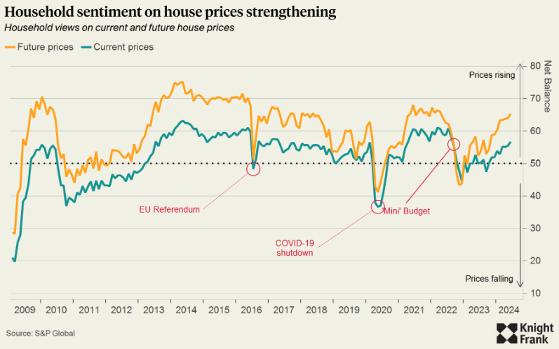 Falling mortgage rates will boost sentiment, which is improving already. S&P Global's measure of household views on the trajectory of house prices now and in the future show a clear post-election bounce (see chart).