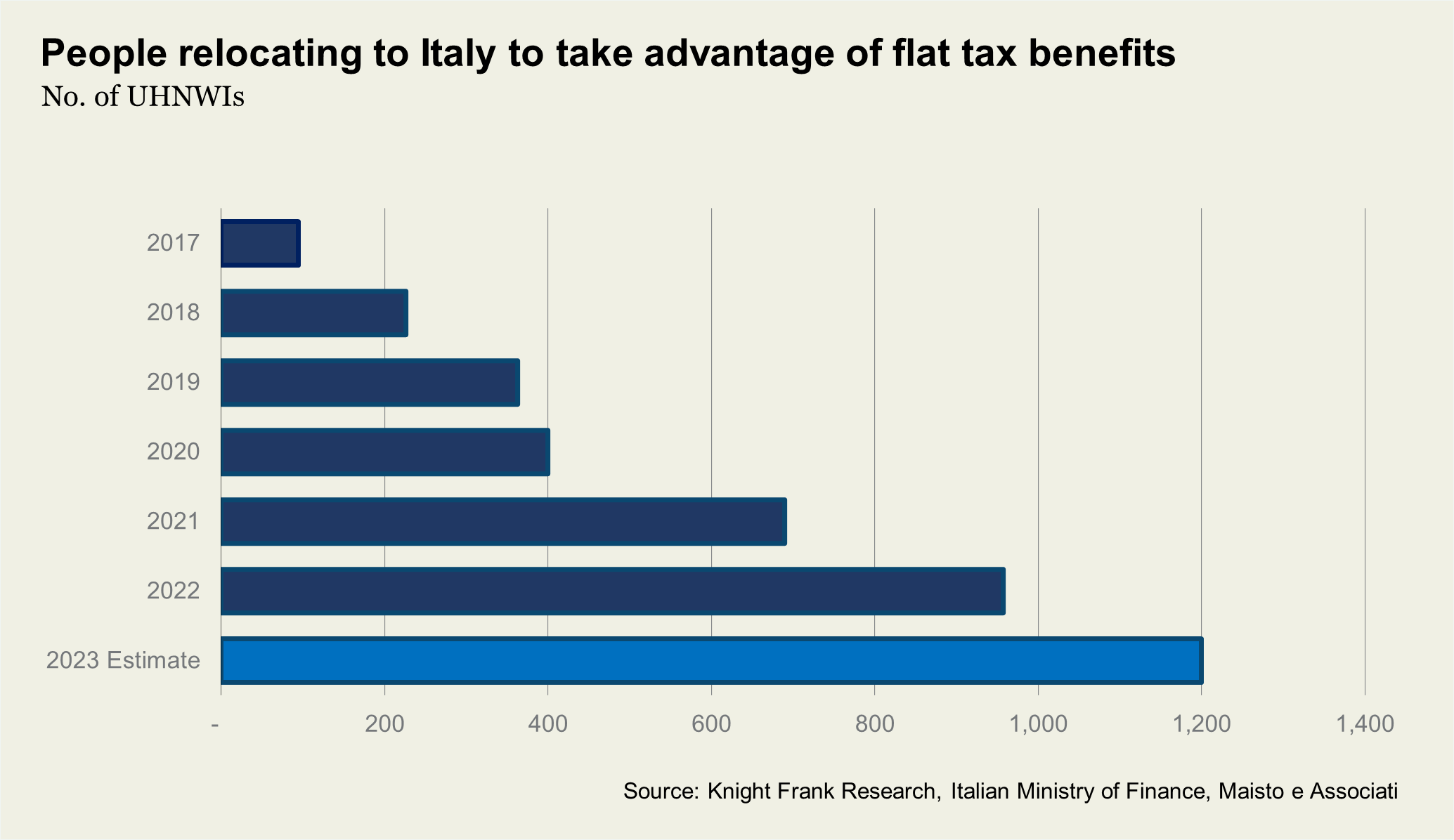 According to the Italian Ministry of Finance, 2,730 individuals signed up for Italy's flat tax between 2017 and 2022. Italian tax lawyers from Maisto e Associati estimate a further 1,200 UHNWIs took advantage of the initiative in 2023 taking the total to close to 4,000.