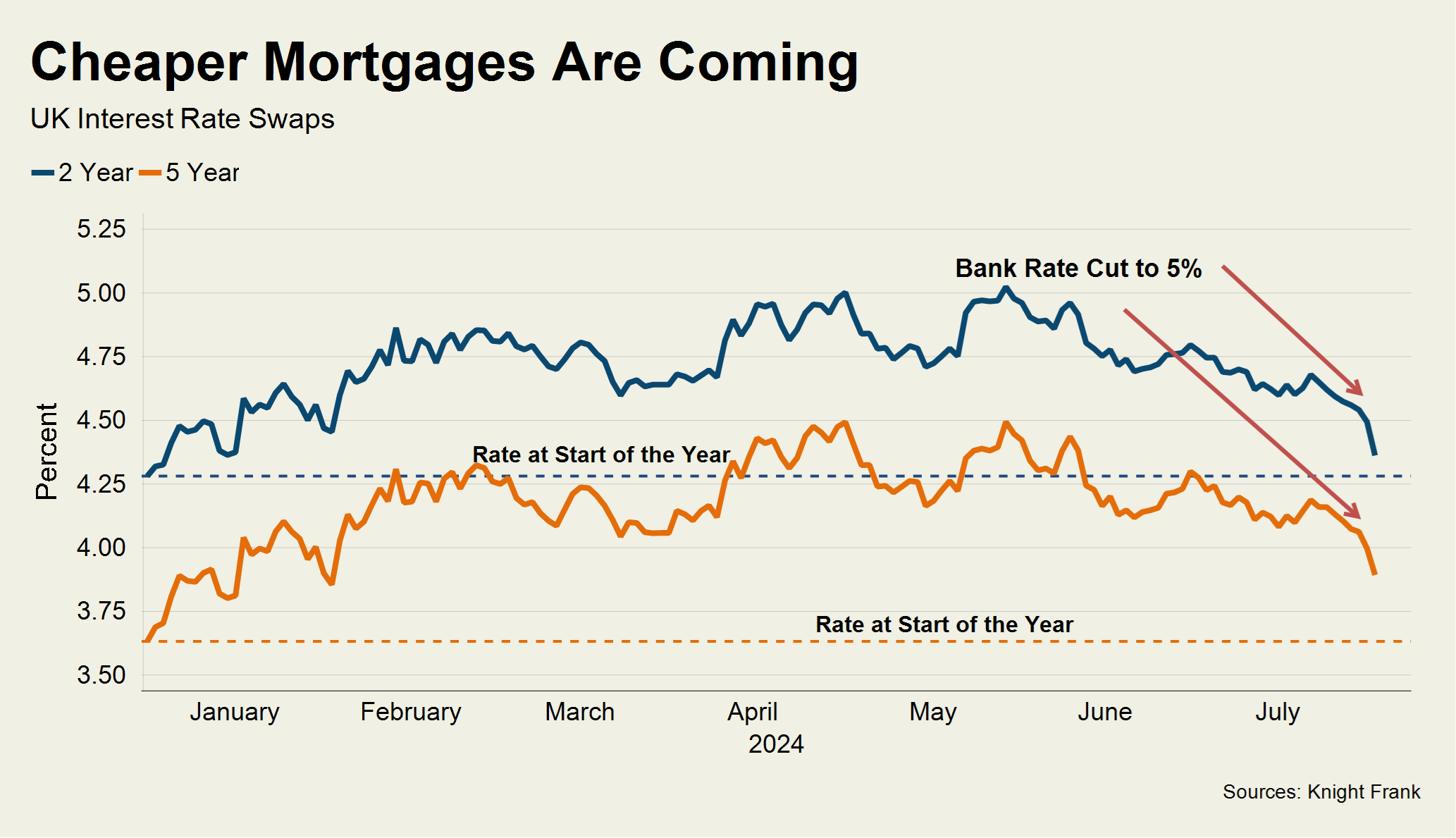 Buyer appetite will be boosted by last week’s cut in the bank rate to 5% from 5.25%. With the election behind us and borrowing costs gently declining, the backdrop will certainly be more conducive towards the end of the year.