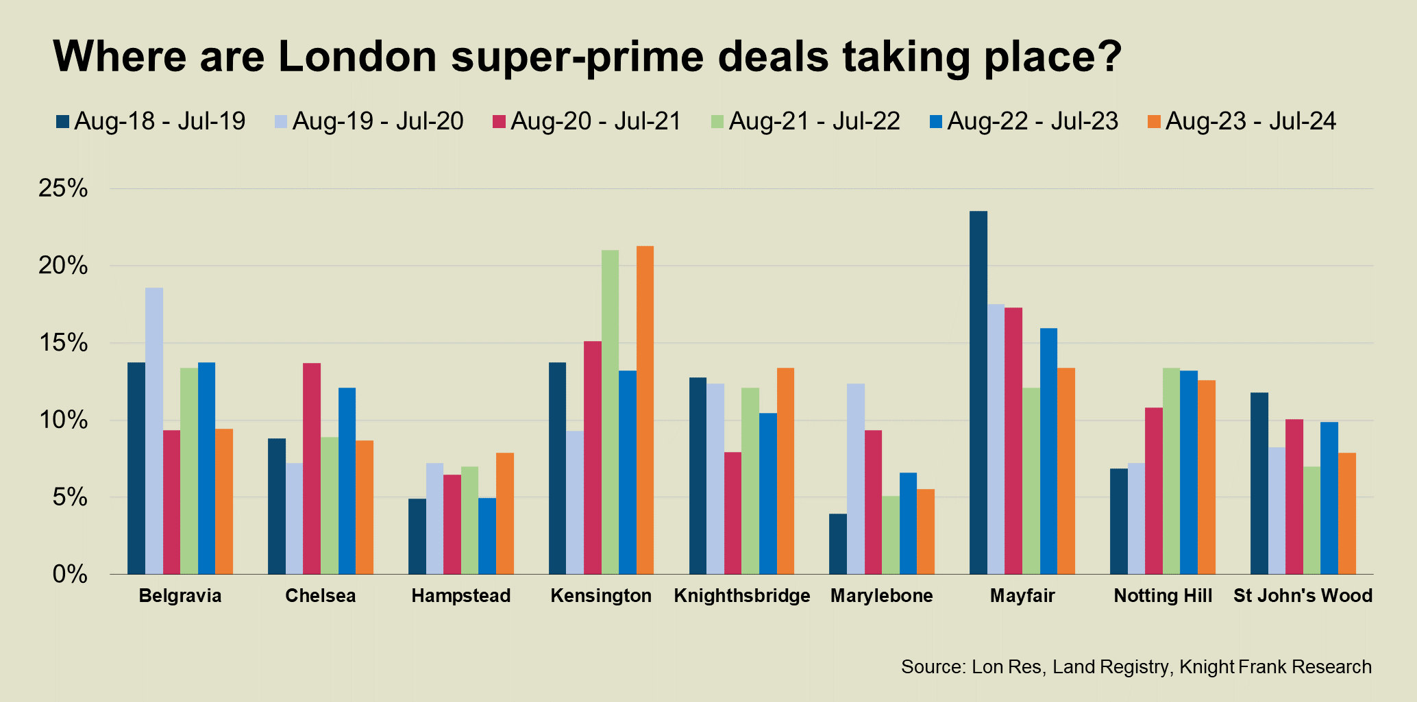 The biggest percentage of super-prime deals in the year to July was in Kensington (21%), followed by Notting Hill (13%), Mayfair (13%), Knightsbridge (13%), as the chart shows.