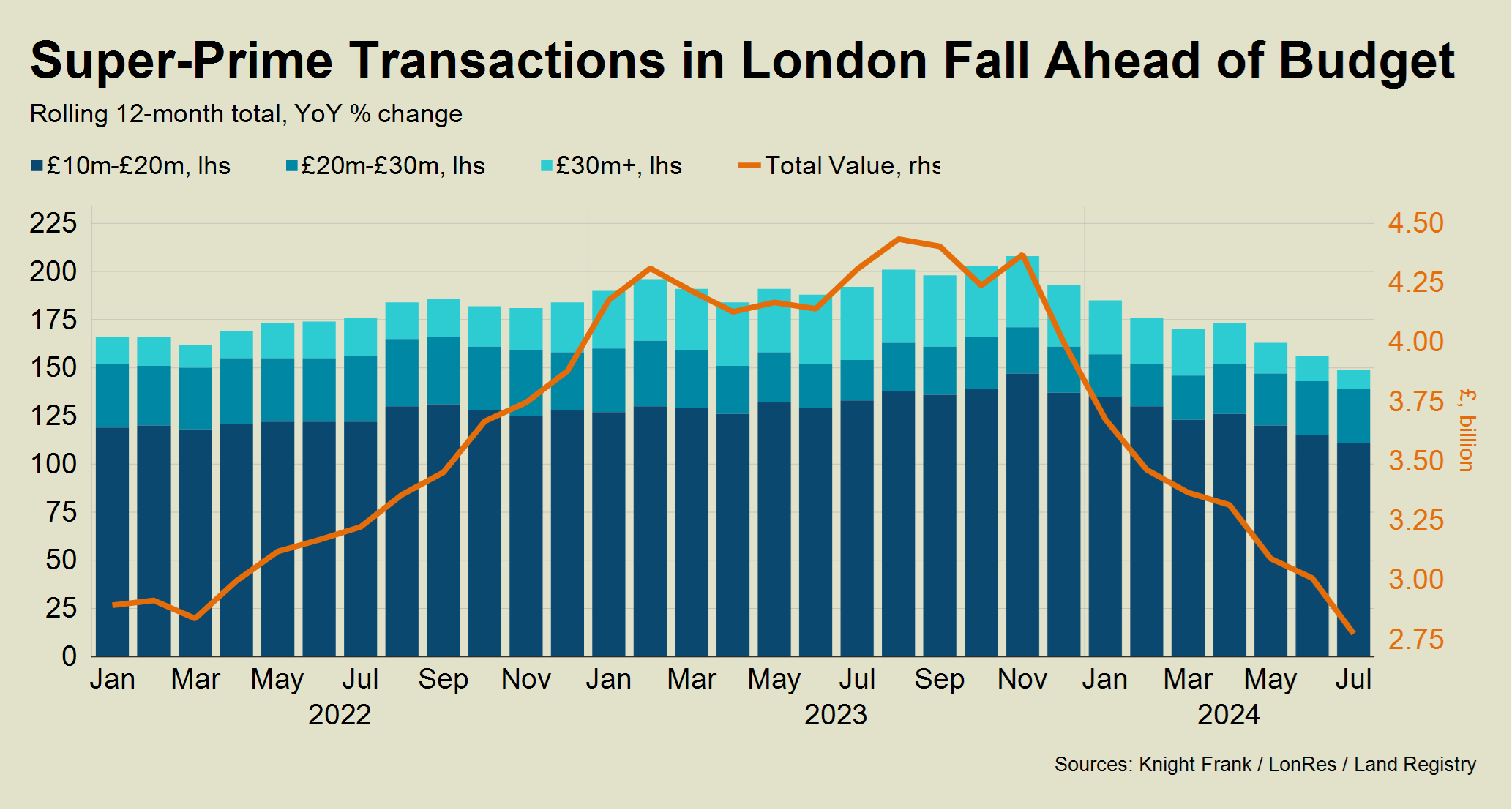 As a consequence, the total value of transactions over the last 12 months above £10 million has fallen disproportionately compared to sales volumes.