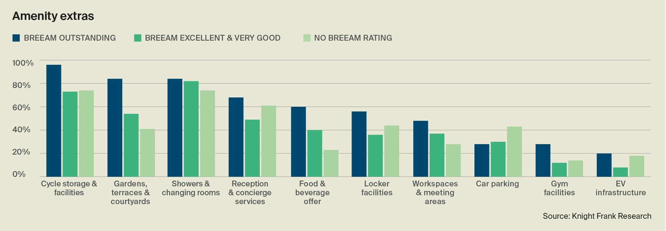 Outdoor amenity provision is high for buildings retrofitted to the best sustainability credentials: 84% of office buildings across England and Wales that have undergone refurbishment and achieved BREEAM 'Outstanding' certification have gardens, terraces, and courtyards, whereas only 54% of those achieving ‘Excellent’ or 'Very Good' have these and 40% of those without BREEAM certification. We explore data from 400 retrofit cases across the UK to understand the amenity level the market is currently delivering and the level of certification achieved on page 15.