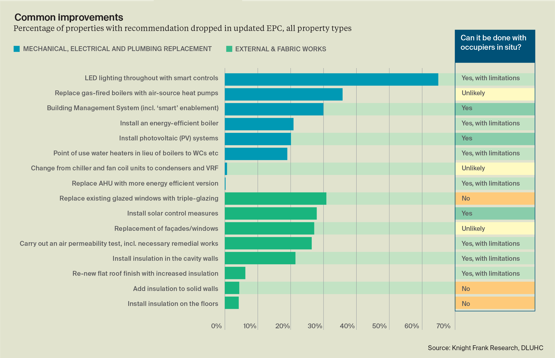 Not all solutions are capex intensive or require vacant possession to be effective: For example, whilst on average four interventions are required, 65% of properties that improved to an EPC B rating installed LED lighting with smart controls, as one of the measures, while only 36% replaced gas-fired boilers with an air-source heat pump, among other actions. Meeting regulatory and functional requirements will likely require sequencing actions and different implementation levels. We assess the prevalence of different improvements to buildings to improve EPC ratings to a minimum of B on page 7.