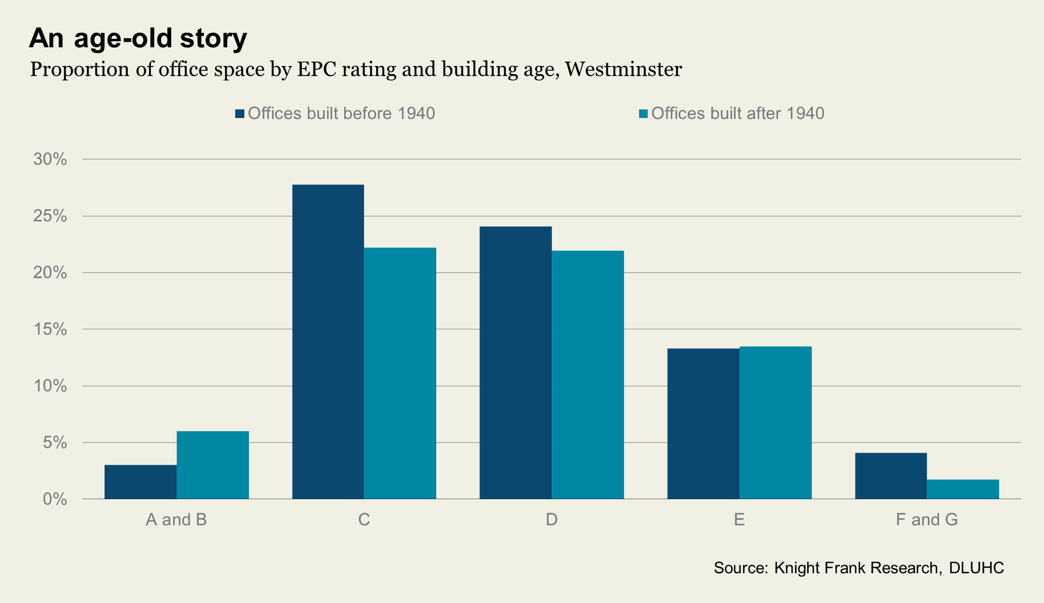 But what does this mean for historic properties? We examined those in Westminster to see the impact. According to Valuation Office Agency (VOA), Westminster has over 51 million sq ft of office space in total. Reflecting the broader picture, the majority of offices in Westminster fall within EPC ratings C to D, some 47% of floor space. When we consider the building age, there is a difference in energy efficiency. Over 40% of offices built after 1940 achieve an EPC rating of A-C, compared to just over 30% of those constructed before 1940.