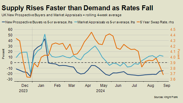 The number of new prospective buyers in the four weeks to 14 September in the UK was 15% below the five-year average, Knight Frank data shows. Meanwhile the number of market valuation appraisals (which are requested by owners looking to sell) was 12% higher.