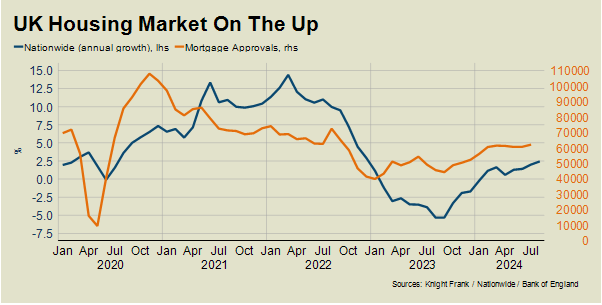Last Friday, Nationwide said annual house price growth (2.4%) was the strongest since December 2022. On the same day, mortgage approvals reached their highest level since September 2022 and residential transactions in July were 5% above the five-year average.