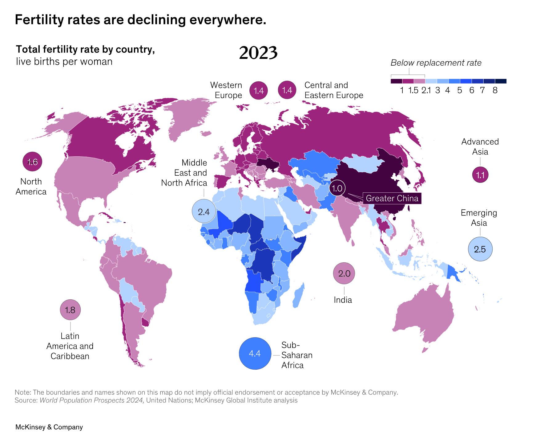 This structure is being reshaped into something more akin to an obelisk as birth rates fall around the world. Across western economies and China, birth rates are now well below the rate of 2.1 required to maintain steady populations (see map). At this rate, falls in populations will be dramatic - in China, the share of people of working age will fall to 59% in 2050, from 67% today, according to a new McKinsey report.