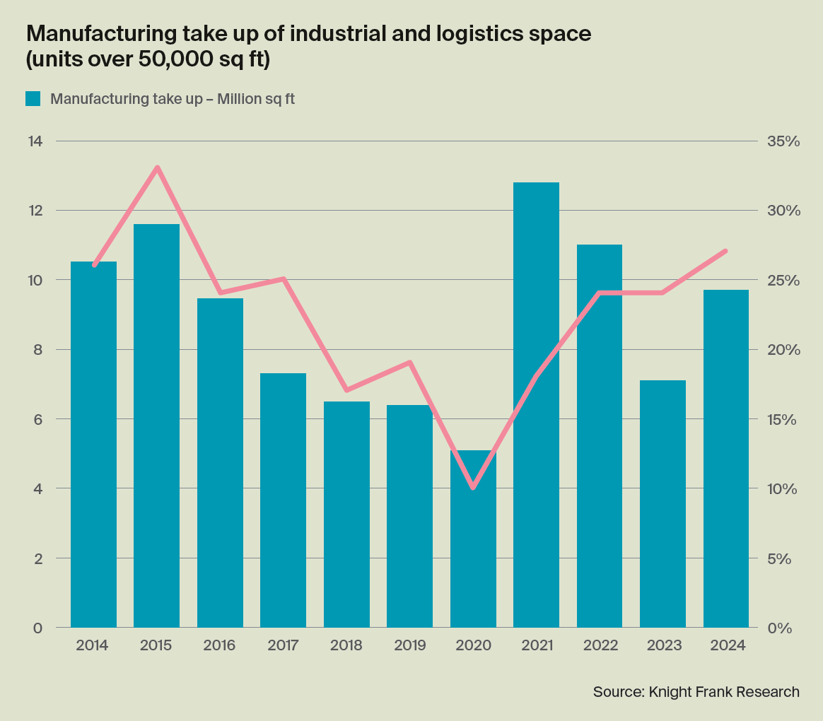 Over the past three years, manufacturers have taken up 28 million sq ft (units over 50,000 sq ft). And in 2024, manufacturing accounted for 27% of take up. Significant subsectors include aerospace and automotive manufacturing, as well as food manufacturing and advanced manufacturing and engineering firms. Take up by fabricators of semi-finished products and component parts (e.g. metals, plastics and rubber products) has also been an important segment of the market, with demand for these intermediate products stemming from growth in energy manufacturing, defence, and pharma as well as other sub-sectors.