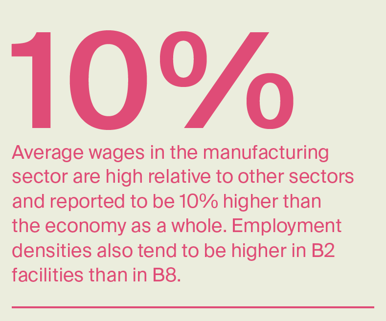 In general, manufacturing operations tend to require a larger, more specialised workforce compared with storage and distribution operations (of an equal size). Average wages in the manufacturing sector are high relative to other sectors and reported to be 10% higher than the economy as a whole. Employment densities also tend to be higher in B2 facilities than in B8.