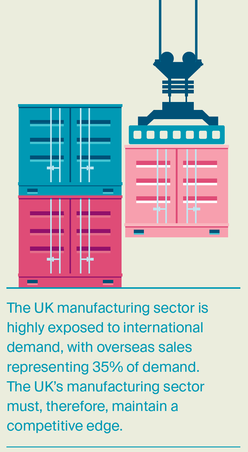 The UK manufacturing sector is highly exposed to international demand, with overseas sales representing 35% of demand. The UK’s manufacturing sector must, therefore, maintain a competitive edge. This means positioning itself effectively in key, high-value growth sectors as well as maintaining a relative cost advantage within those sector specialisms.