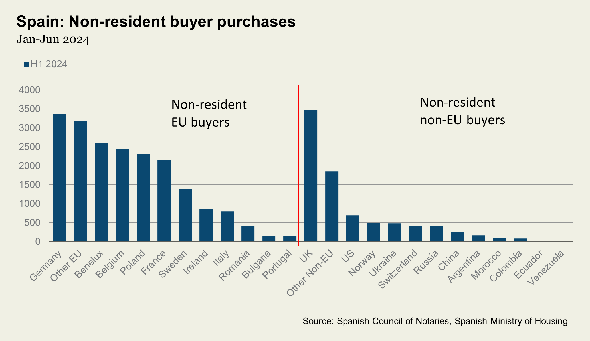 According to the Spanish Council of Notaries, non-EU residents accounted for around 8,476 of the 350,202 sales recorded in the first half of 2024, equating to 2.4% of sales. By comparison, EU residents (non-Spanish) accounted for some 19,857 or 5.7% of sales.