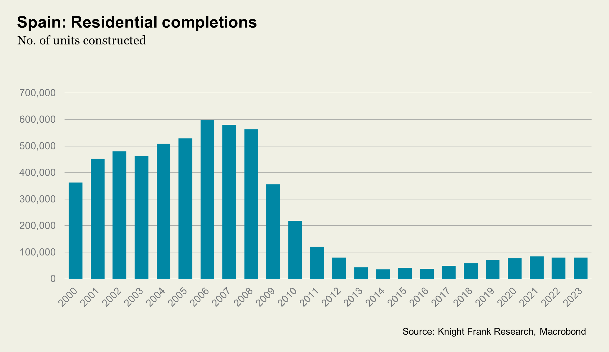 According to Spain’s Ministry of Housing, residential completions have dramatically decreased from 597,632 just before the 2008 financial crisis to 80,473 in 2023, with only a slight increase in the years following the pandemic.