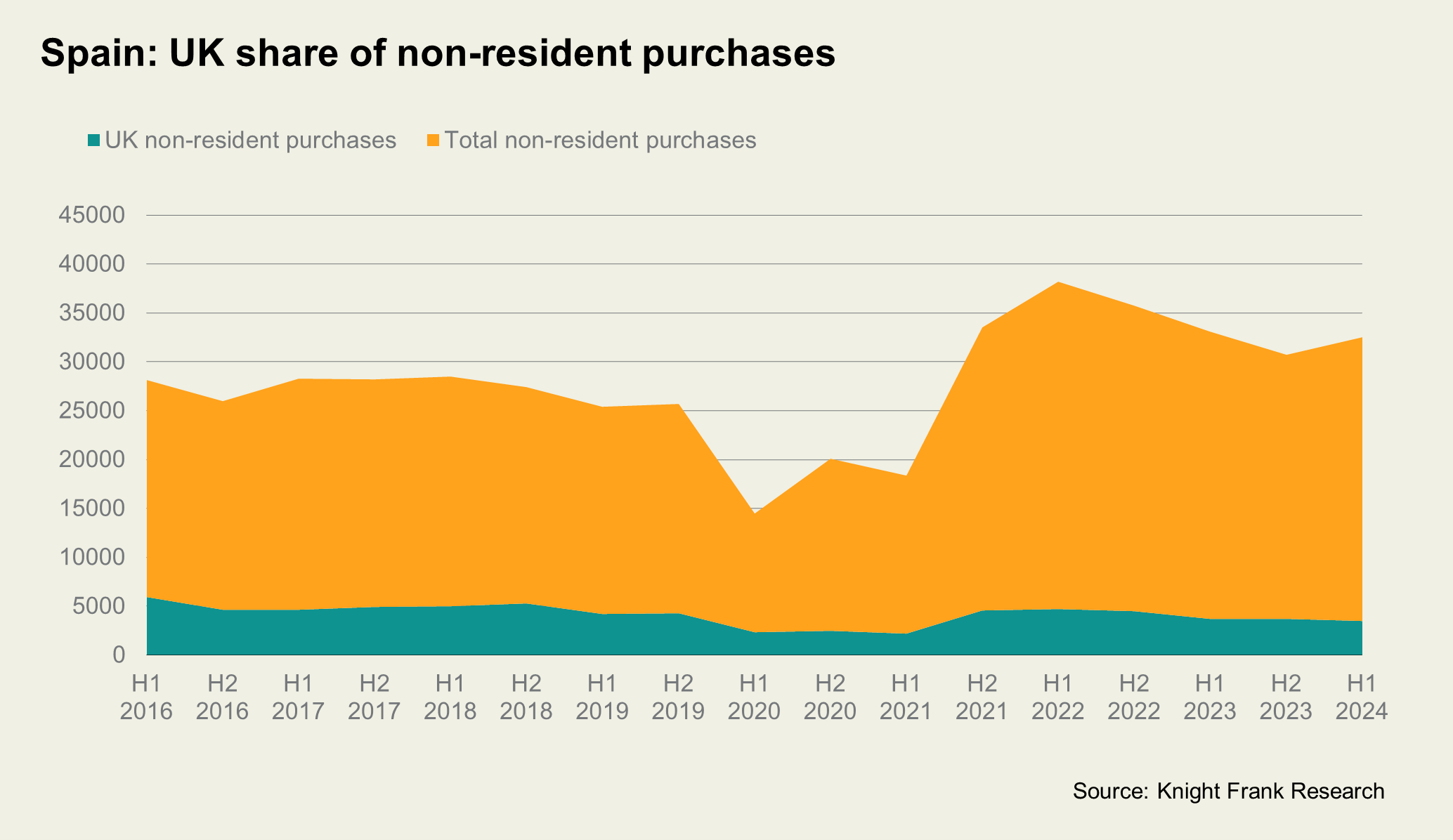 Taking all UK purchases, both resident and non-resident into account, the UK market share has fallen significantly, from almost 10% of all purchases a decade ago to 4.2% in the first half of 2024 according to the Spanish Council of Notaries.