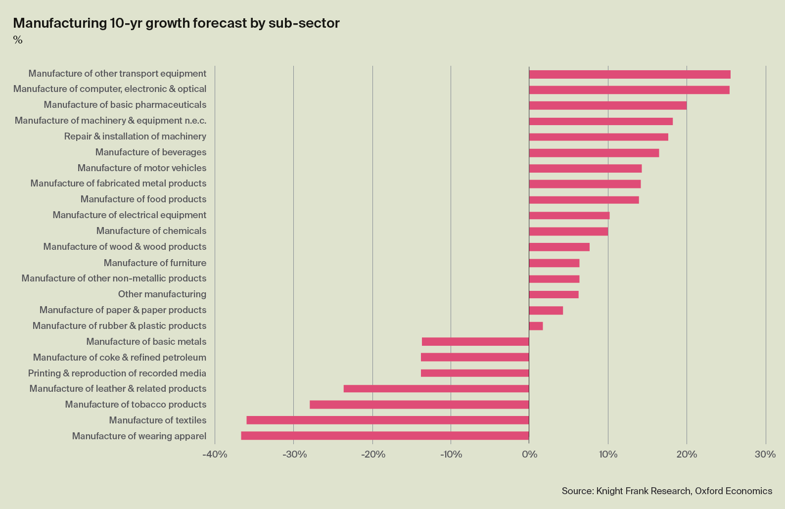 Manufacturing output is forecast to grow 12% in the next ten years. This compares with 8.6% growth over the past ten years. Productivity gains in the past ten years (c.9%) have meant that floor space occupied by manufacturers has changed very little. However, expansion of existing sectors, growth of new and emerging sectors and firms seeking to upgrade (or simply relocate) facilities have driven a significant amount of take up in the industrial and logistics sector in recent years. While productivity gains are likely to continue, the accelerating growth, coupled with ongoing shifts in terms of the composition of the sector, will mean new sources of demand with shifting requirements.