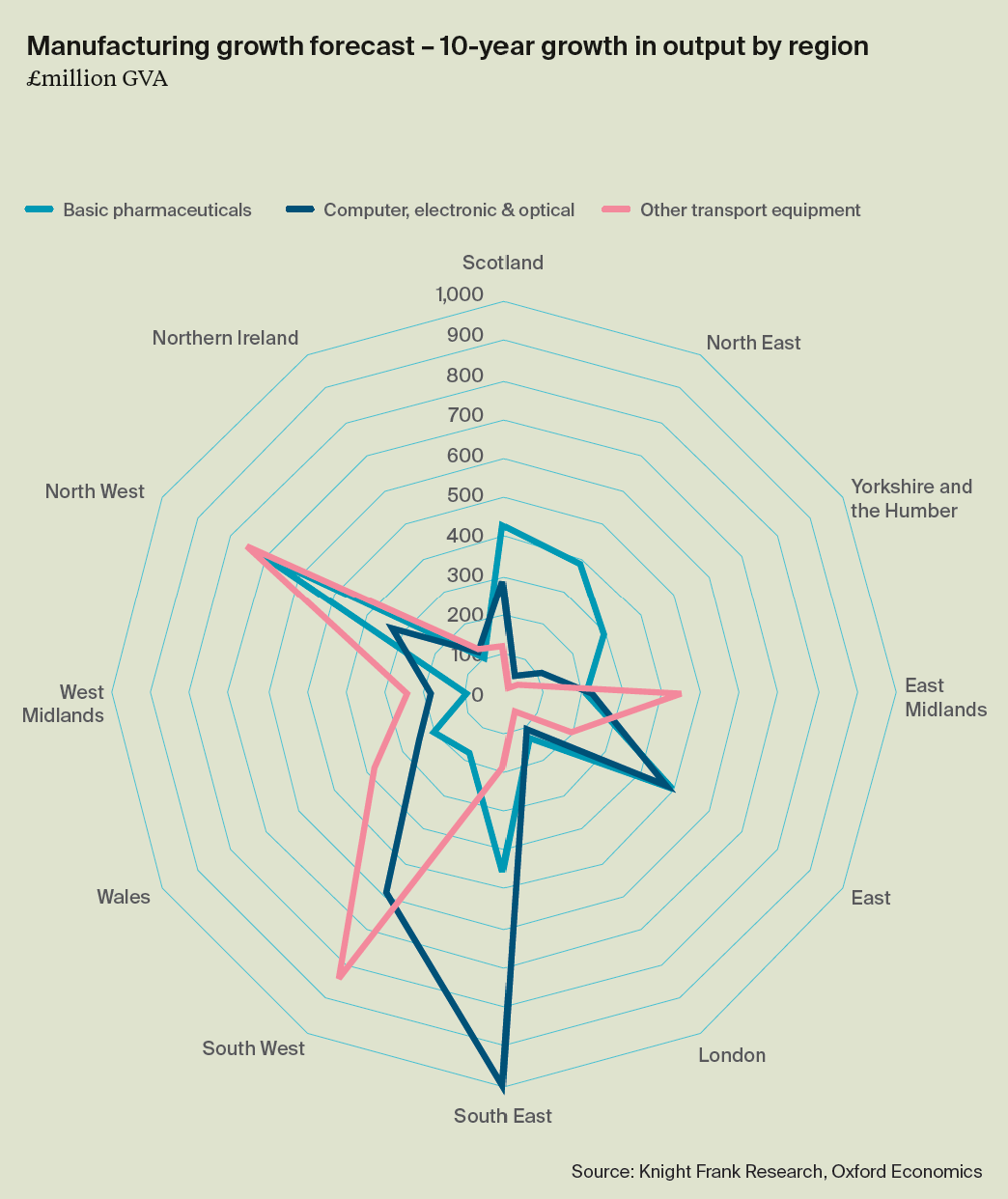 The top three growth sectors within manufacturing are other transport equipment, computer electronic and optical, and the manufacture of basic pharmaceuticals. The regions expected to benefit most from the expansion of these growth sectors are the North West, South East and South West.
