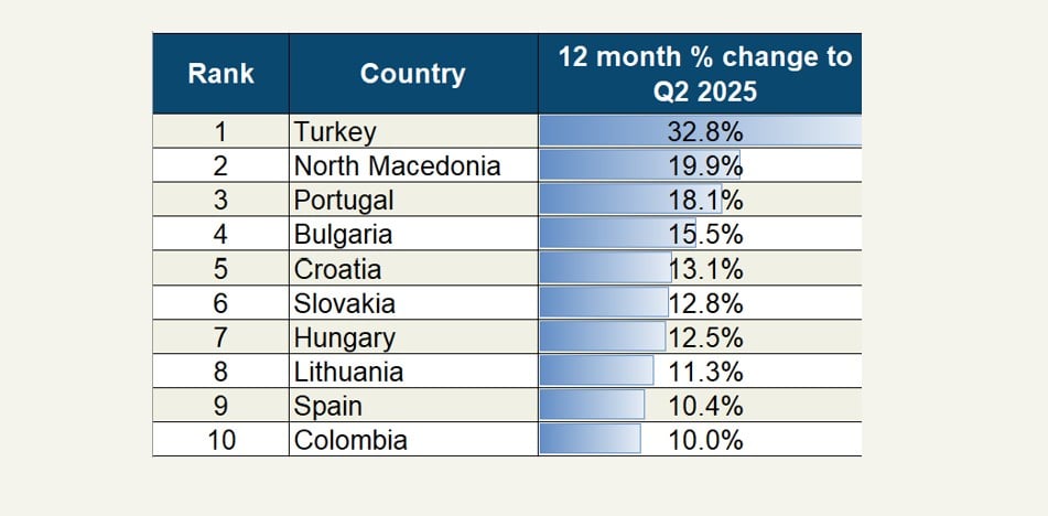 North Macedonia topped the rankings with nominal price growth of 19.9% year-on-year, followed closely by Portugal at 18.1%. Bulgaria rounded out the European podium with 15.5% gains, according to the data which tracks the annual change in residential prices to Q2 2025.