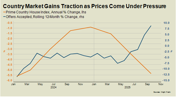 The number of offers accepted in the Country, which covers a range of urban and rural markets above £750,000 outside London, was 9% higher in the year to September than the previous 12 months.