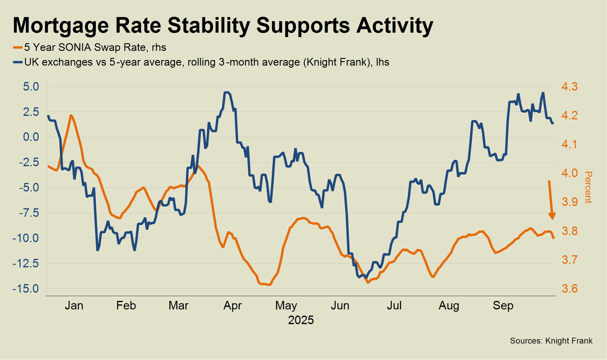 One positive piece of news in recent months has been the stability of mortgage rates, as the chart shows. The availability of sub-4% mortgages has supported transactions, which have risen above their five-year average in recent weeks, as Knight Frank data shows.