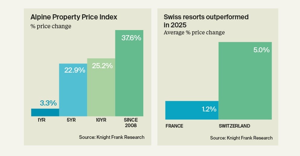French resorts registered steadier gains: Méribel matched St Moritz at 7.1%, and Alpe d’Huez reached 5.7%. Overall, the Alpine Property Index rose 3.3% in the past year, with Swiss markets outperforming at 5% annual growth on average versus France’s 1.2%. The index now stands 23% higher than five years ago, underscoring a renewed era for alpine living.