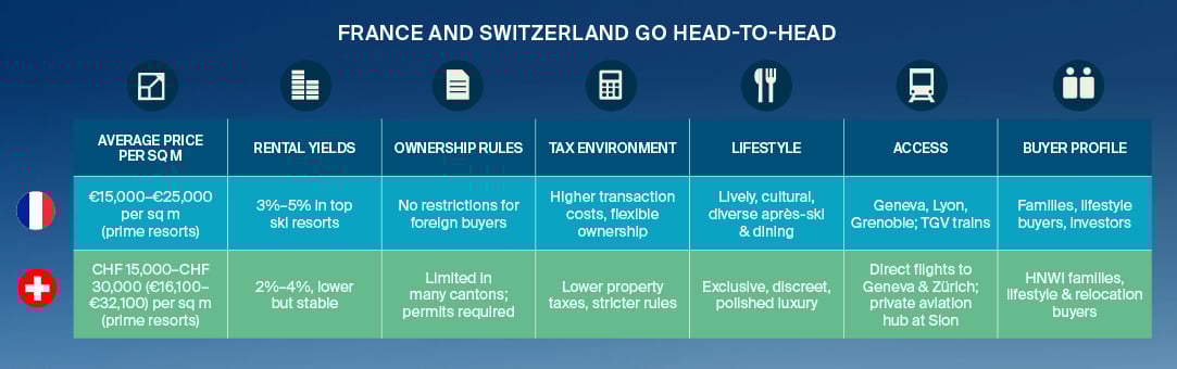 Choice. Buyers have unrestricted access to properties across the market, a freedom not available in Switzerland due to stricter regulations. Whether seeking a ski-in chalet, a modern apartment or a mountain estate, France offers flexibility for every lifestyle and budget.