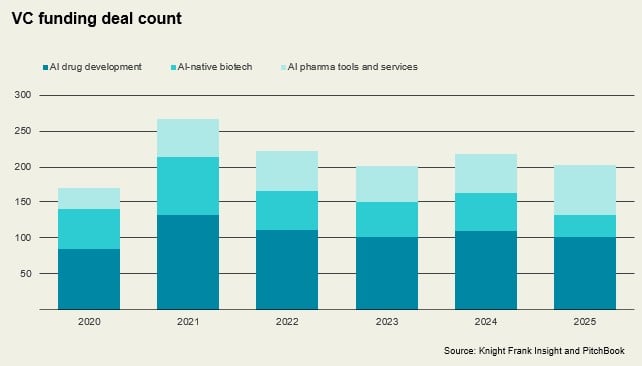 Investors are also warming to AI in pharma tools and services. These are firms that do not develop their own pipelines but sell AI capabilities into others’ labs and trials. They range from AI “lab assistants” to clinical-trial optimisation and outsourced AI service providers. Lila Sciences, for example, is building AI systems that work with lab robotics to automate the scientific process and is now expanding globally. For real estate planners and lab operators, this points to growing demand for highly instrumented, automation-ready facilities rather than traditional wet labs alone.