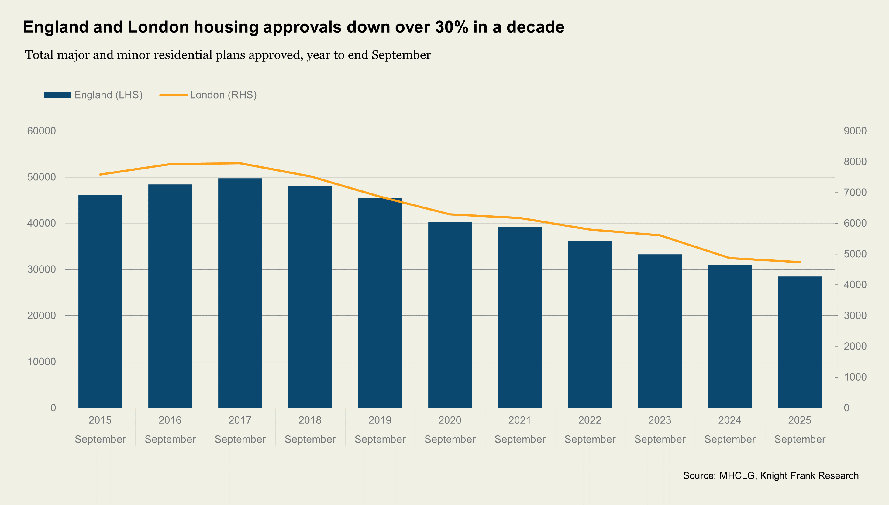 The latest provisional figures show that permission for 208,000 homes in England was given in the year to September 2025, down 15% from the 245,000 homes granted permission in the year to September 2024, according to Glenigan.
