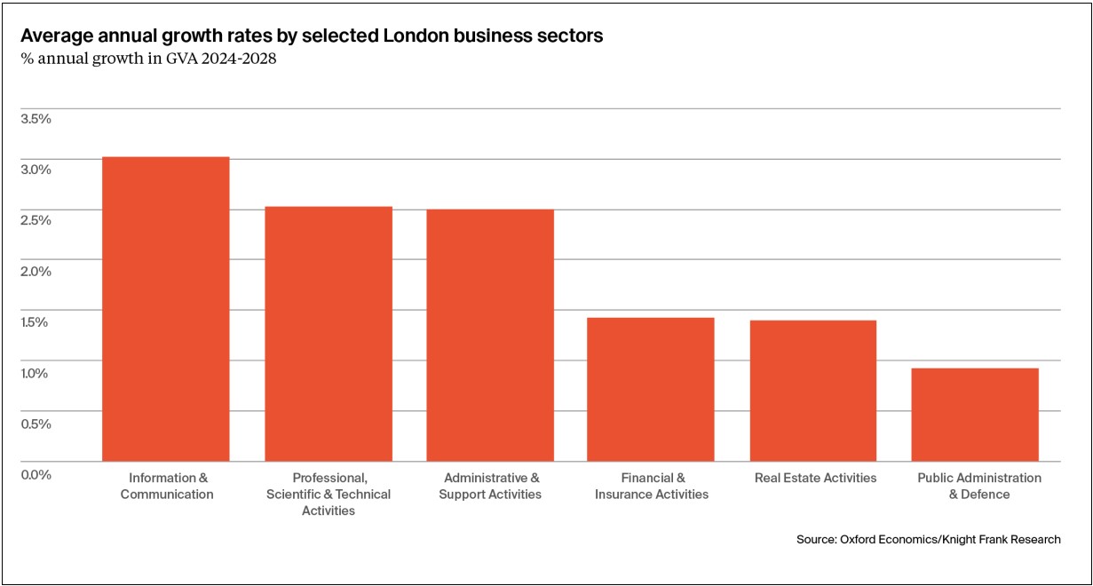 The headline numbers make a convincing case for London’s resilience. Estimates from the Greater London Authority suggest that GVA rose by a healthy 1.1% in 2024, with forecasts from Oxford Economics accelerating to around 2% for each year until the end of the decade, albeit with significant outperformance in key sectors.