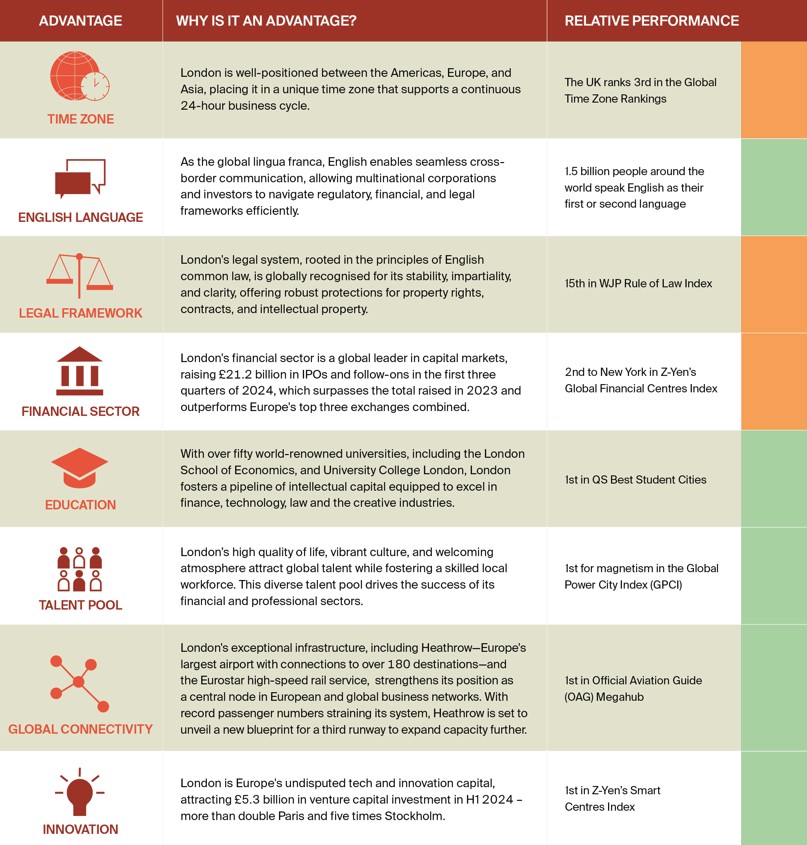 - London's unigue business appeal: According to our interviewees, London remains a leading global business destination due to its historical significance, robust financial ecosystem, and exceptional talent pool. Interviewees highlighted the city's role as a historic trade hub that continues to attract international businesses seeking a strategic base. Its sophisticated financial landscape – characterised by strong flows of private equity and credit – ensures access to capital, while its globally respected legal and regulatory framework fosters confidence among investors.
