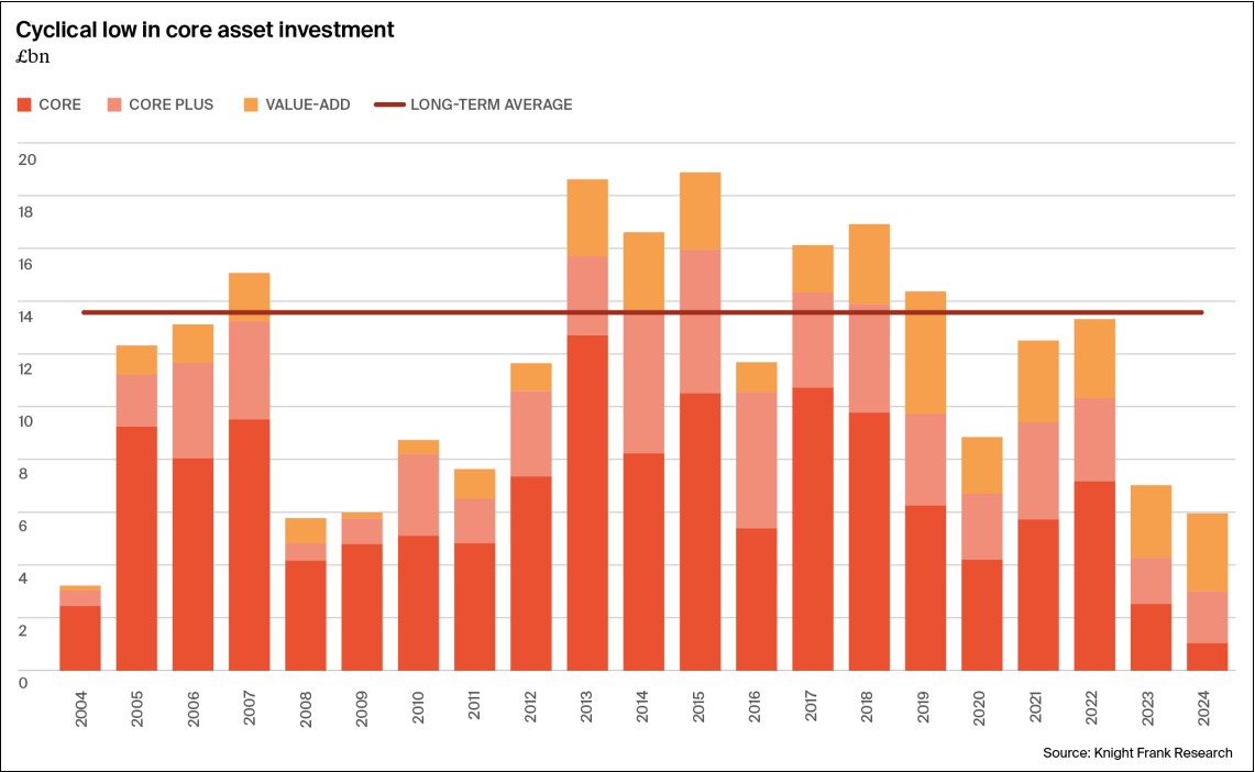 However, the asset risk profile which typically drives the bulk of market turnover is ‘core’. We define core as high-quality, income- producing properties located in prime, well-established markets and which typically feature long-term leases with stable, creditworthy tenants, providing consistent and predictable cash-flows with low risk. Core assets accounted for only 17% of market turnover in 2024, as gilt yields and borrowing costs jumped.
