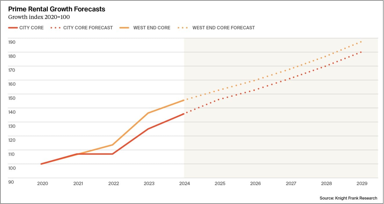 Rising expectations of rental growth: Prime office rents have grown amidst constrained supply, with core submarkets projected to see annual average growth of almost 6% over the next five years.