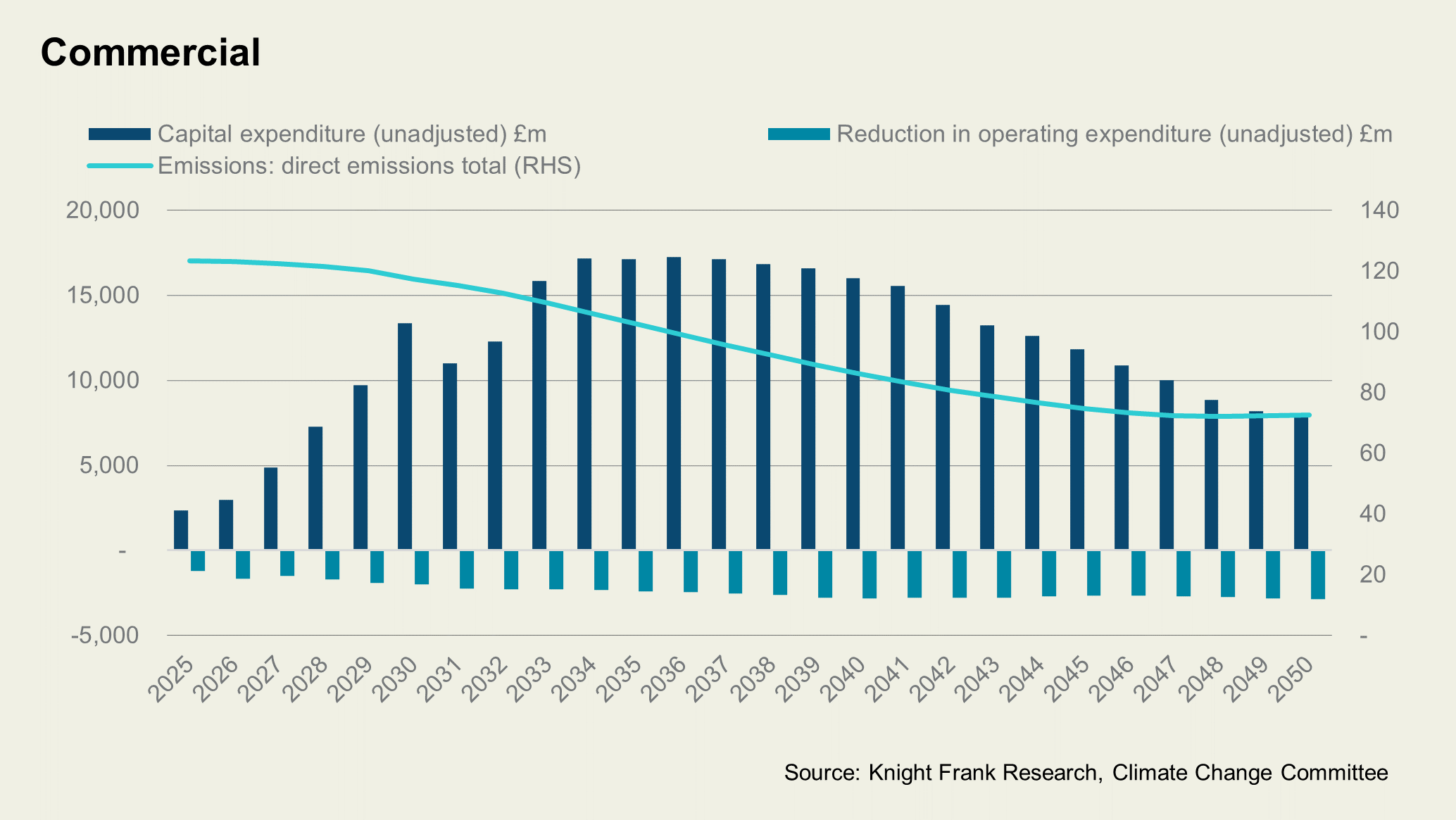Between 2025 and 2030, the average annual net cost for the commercial sector is forecast at £1.3 billion, made up of £1.8 billion in capex, offset by £526 million in savings. Extending this to 2050 yields a net cost of £436 million as savings grow to £1.2 billion and costs fall to £1.6 billion – overall emissions are forecast to fall by 44% by 2050 from a 2025 baseline.