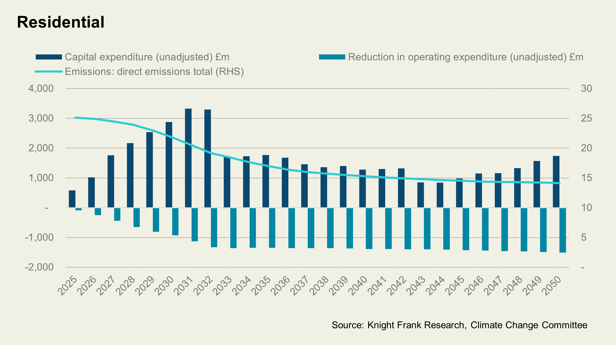The latest net costs for residential decarbonisation are expected to average £5.1 billion per annum between 2025 and 2030. This breaks down to £6.8 billion in capital expenditure, partially offset by almost £1.7 billion in operational expenditure savings. When extending out to 2050, the average net cost rises to nearly £10 billion per annum. The resultant reduction in emissions from the 2025 level is 41%.