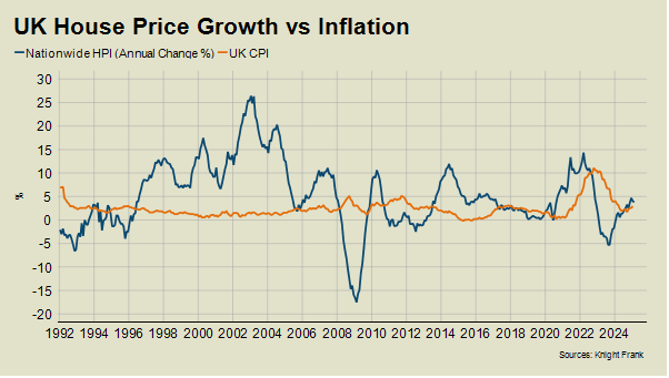 House price growth and CPI are not expected to be very far apart at the end of the year. The latest ONS inflation forecast (which may rise alongside this month’s spring statement) is an average of 2.6% during 2025, while we expect UK house prices to increase by 2.5%.