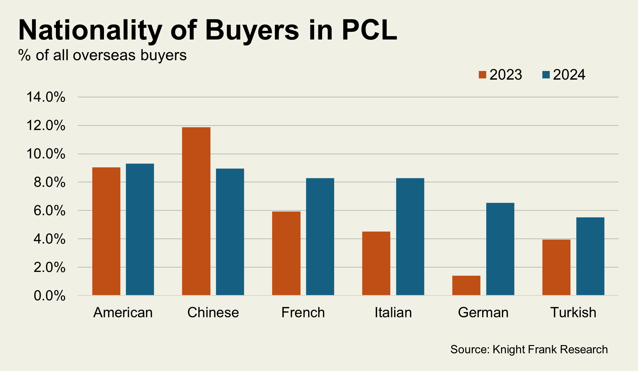 US nationals accounted for 11.6% of overseas buyers in prime central London (PCL) in the final quarter of 2024, which was the largest group ahead of the Chinese (8.1%), Knight Frank data shows. Indeed, they overtook the Chinese to become the largest group last year in PCL, accounting for 9.3% of sales to overseas buyers compared to 5.6% in 2019.