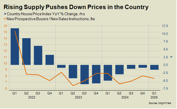As the chart shows, the imbalance between supply and demand kept downwards pressure on prices, which fell by 0.3% over the quarter. It took the annual price fall in the Country to -1.6%, which was the widest decline since Q2 2024.