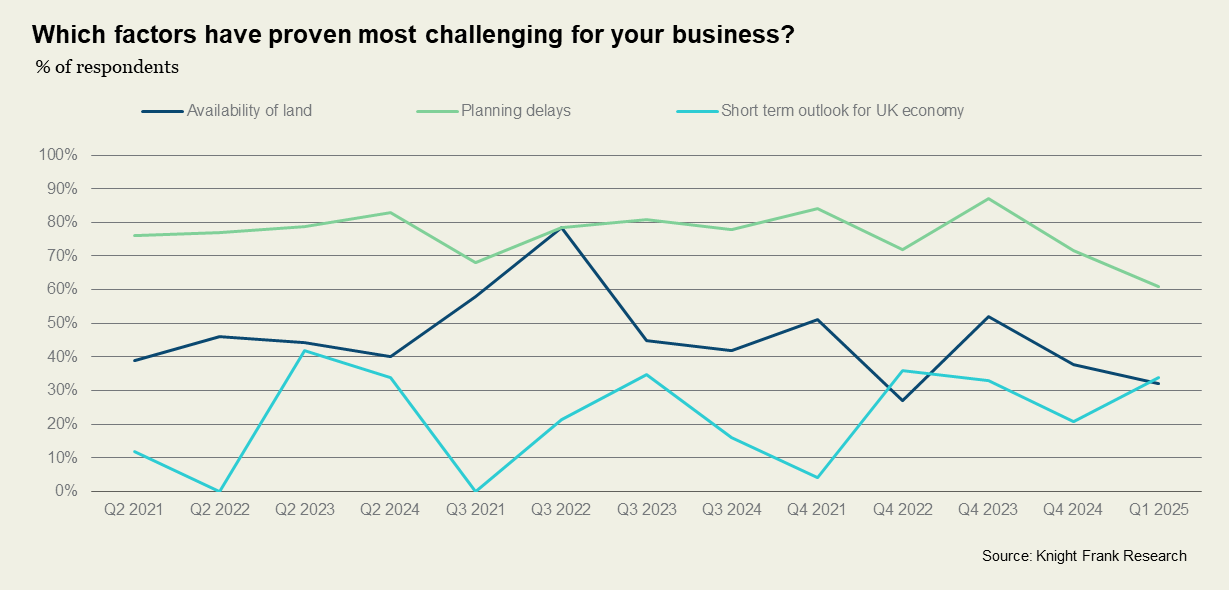 Reflecting this, just six-in-ten respondents to our quarterly survey of more than 50 volume and SME housebuilders cited planning delays as a key drag on activity in Q1, the lowest proportion since we began our survey in 2020.