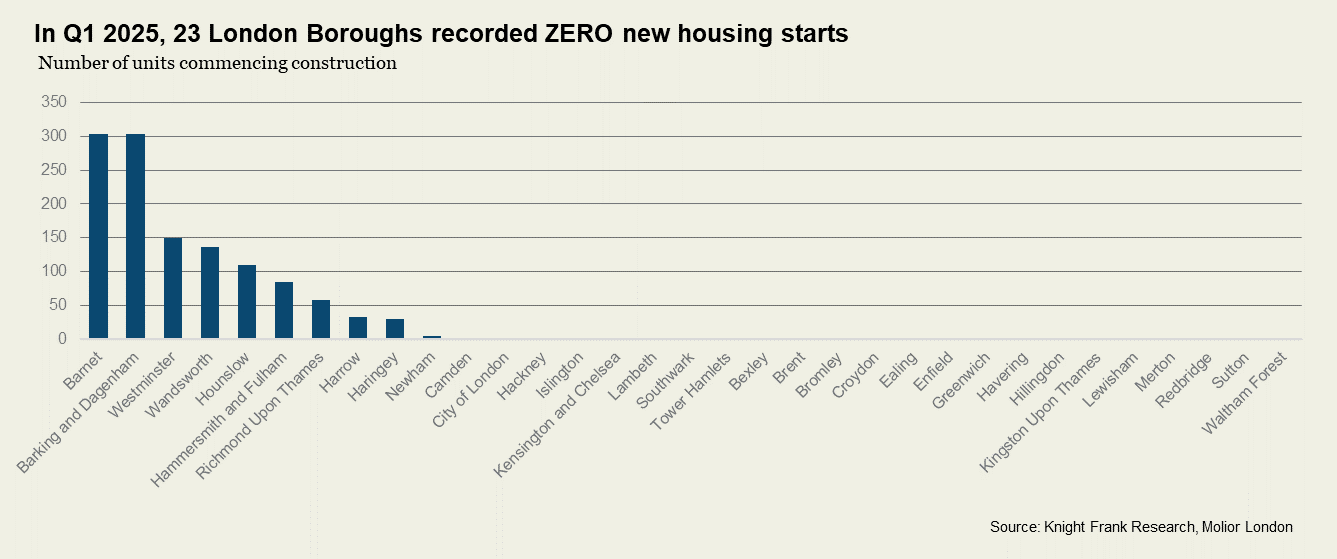 Not a single spade hit the ground in 23 of London’s 33 boroughs in the first three months of the year. That’s right - developers didn’t start a single home in all but ten boroughs. Just 1,210 new homes broke ground across the city, the lowest quarterly figure since the 2009 financial crisis.
