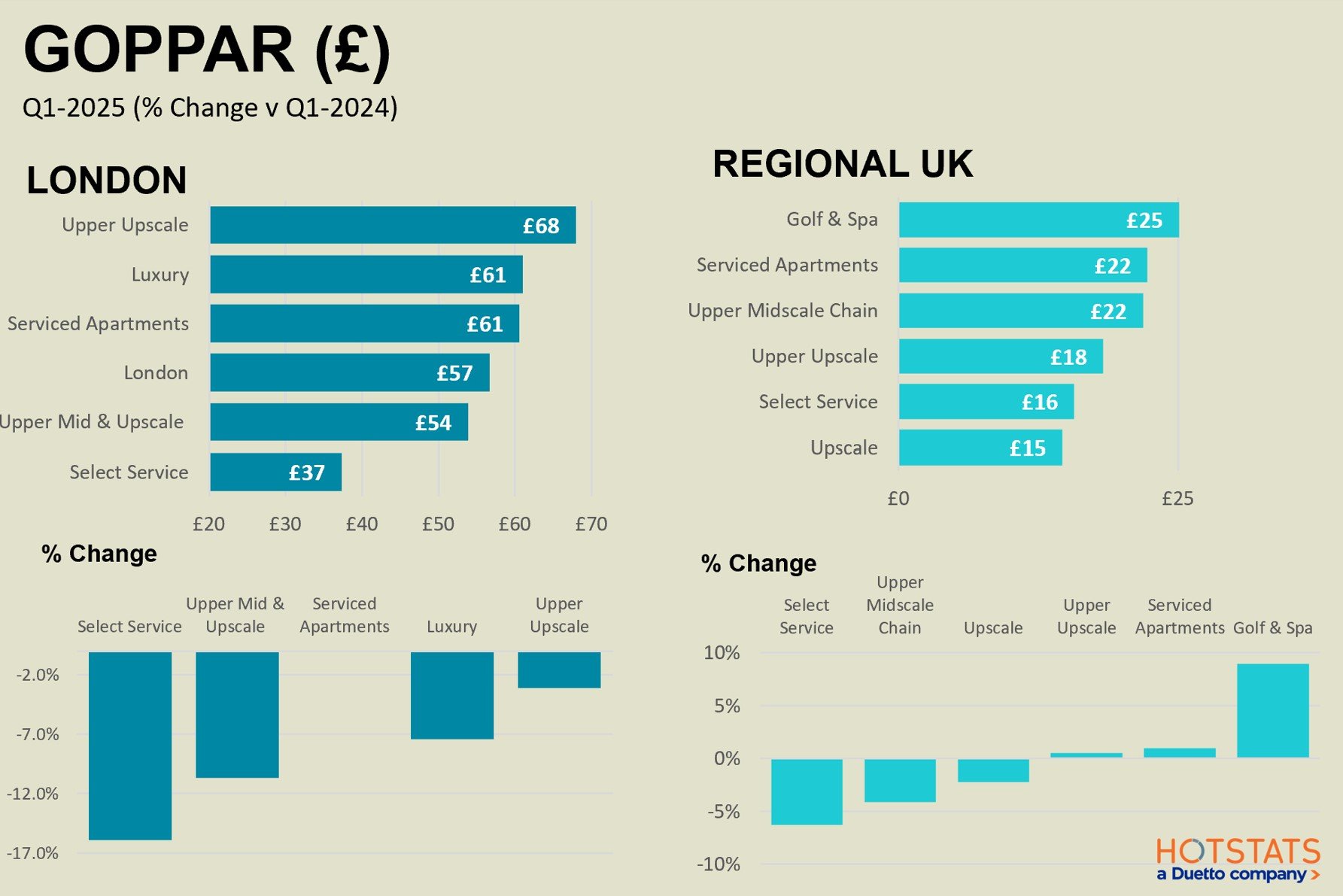 Stagnated revenue growth along with rising costs, has led to a decline in profitability across all London hotel markets, averaging a decline of 8%, along with the profit margin reducing. Across regional UK, Q1 GOPPAR declined on average by 5.4%, except for Golf & Spa hotels continuing to enjoy highly respectable GOPPAR growth, albeit with the pace of growth year-on-year now slowing.