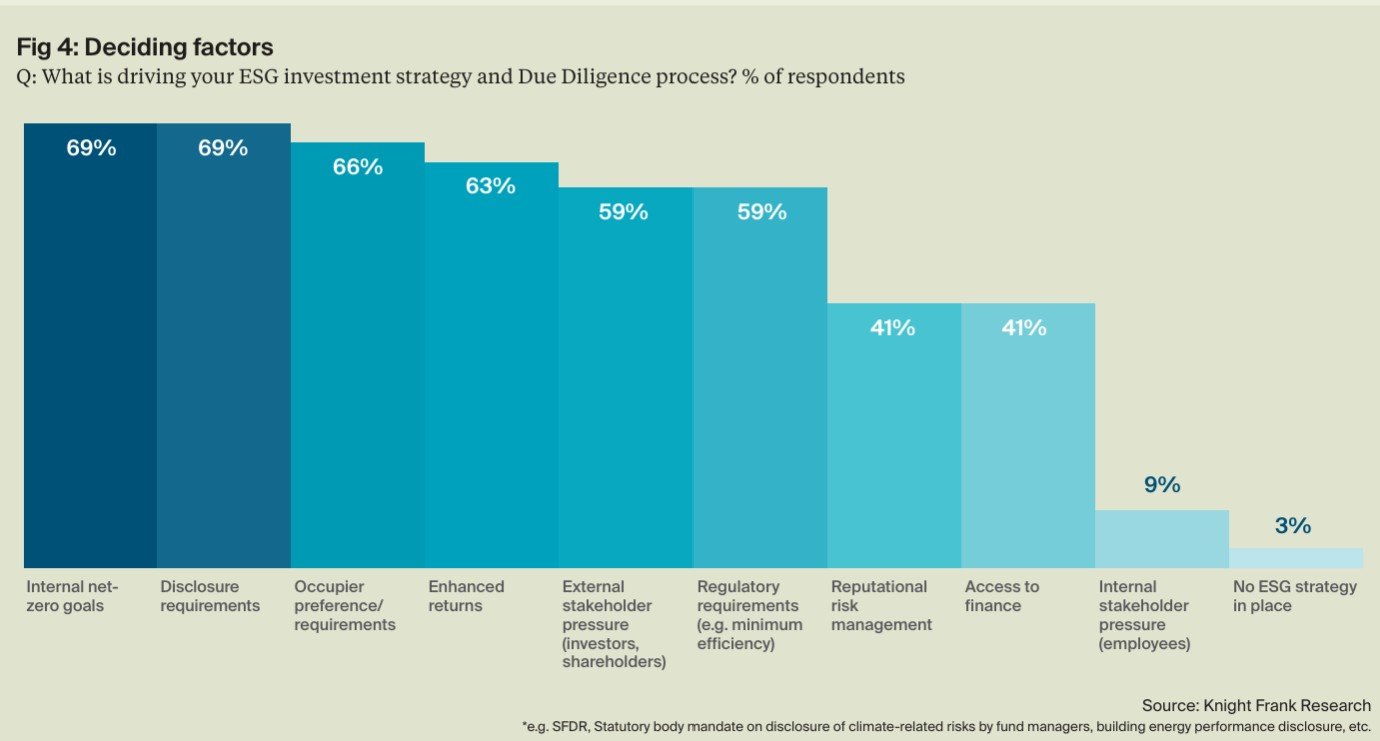 Internal net-zero commitments continue to drive ESG investment, with 69% of respondents citing them as key motivators. While disclosures play a role in transparency, ESG policies and commitments shape procurement and investor expectations in response to growing demand for sustainable practices, making net- zero policies essential to stay competitive, with real estate playing a role in delivering these, see page 5.