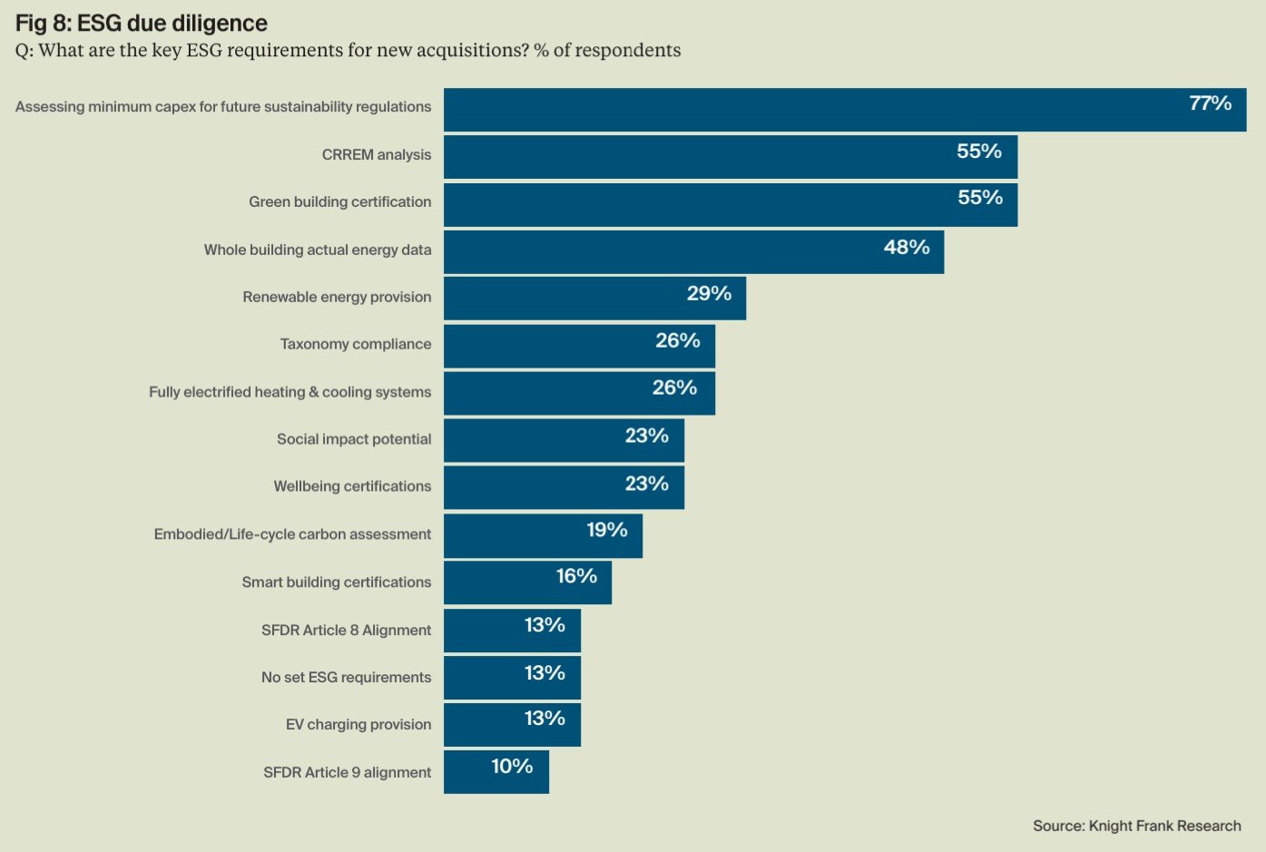More than three-quarters of investors assess minimum capex requirements before acquisition, rising to 89% for institutional funds and 94% for those with mainland European assets. ESG due diligence is increasingly data-driven, with 55% using CRREM to assess ‘stranding dates’, liquidity risks, and 48% requiring whole-building energy data. Understanding asset complexities and planning contingencies is key to avoid underestimating financial impacts and managing risk – key considerations explored further on page 9.