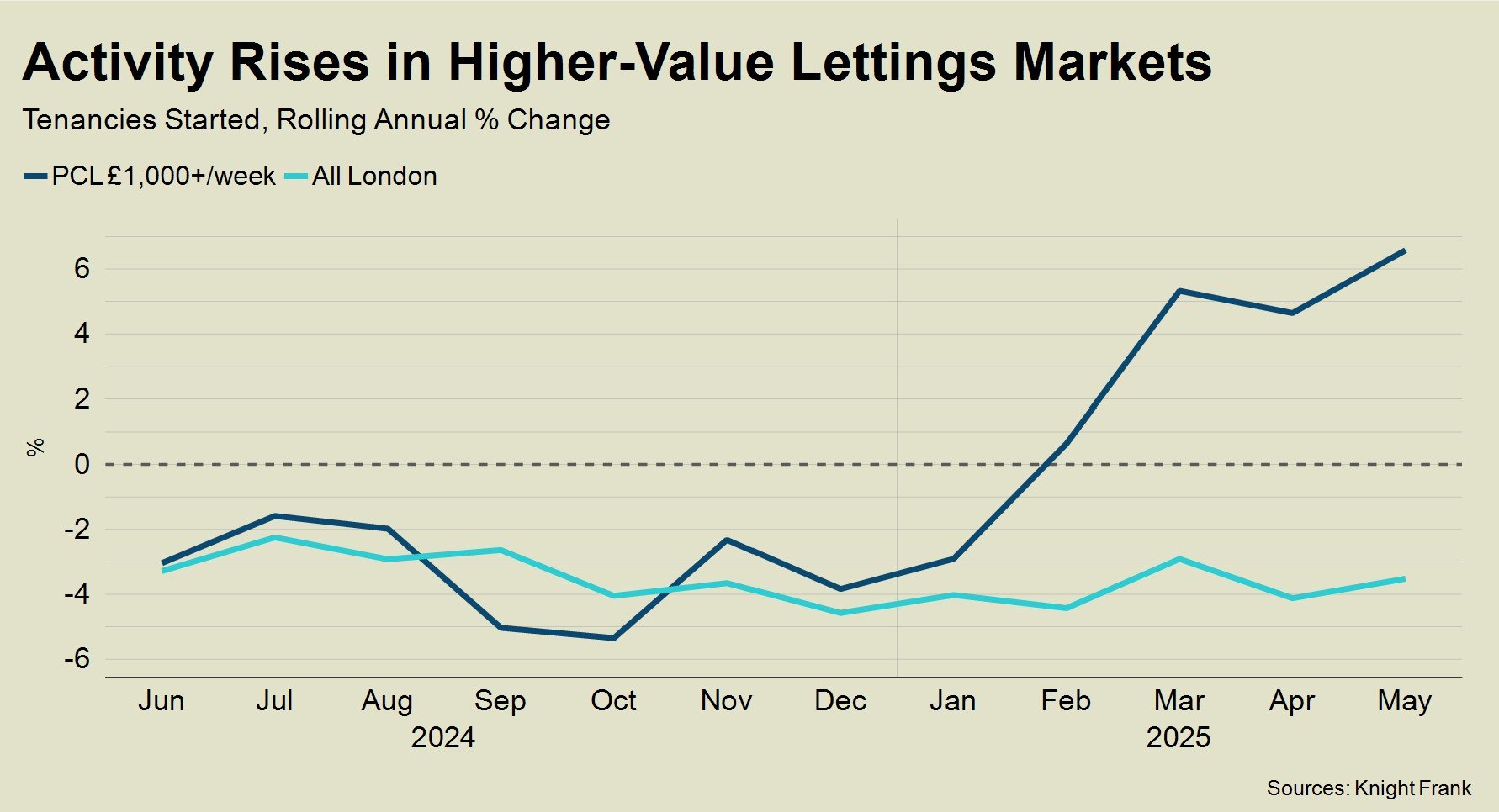 The number of tenancies started above £1,000 per week in PCL in the year to May was 7% higher than the previous 12 months, Knight Frank data shows. Meanwhile, the number of sales above £2m fell 4% over the same period.