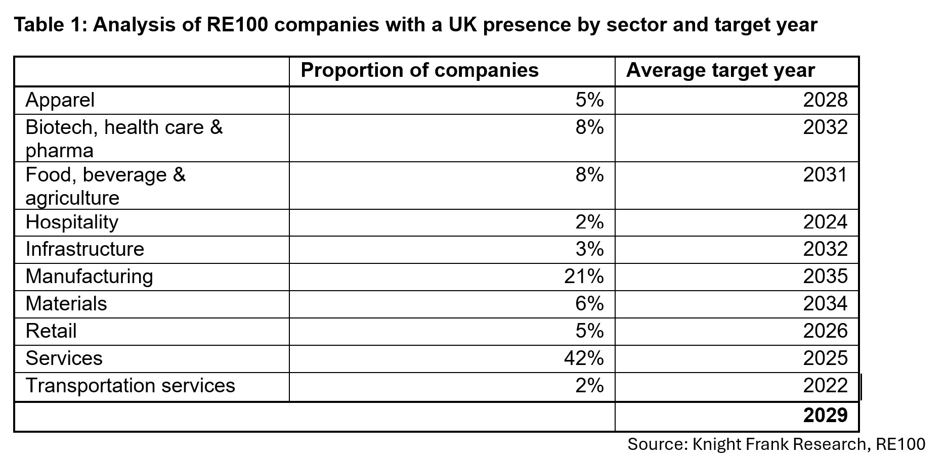 The industry matters with a significant proportion, a third of all global, of those seeking renewable power in the service sectors. Looking specifically at those with a UK presence, 42% are in the services sector and 21% in manufacturing. Those in the service sector have a target date of 2025, this year. Perhaps this is unsurprising given that real estate and power would theoretically be a larger share of emissions, given the nature of the service sector.