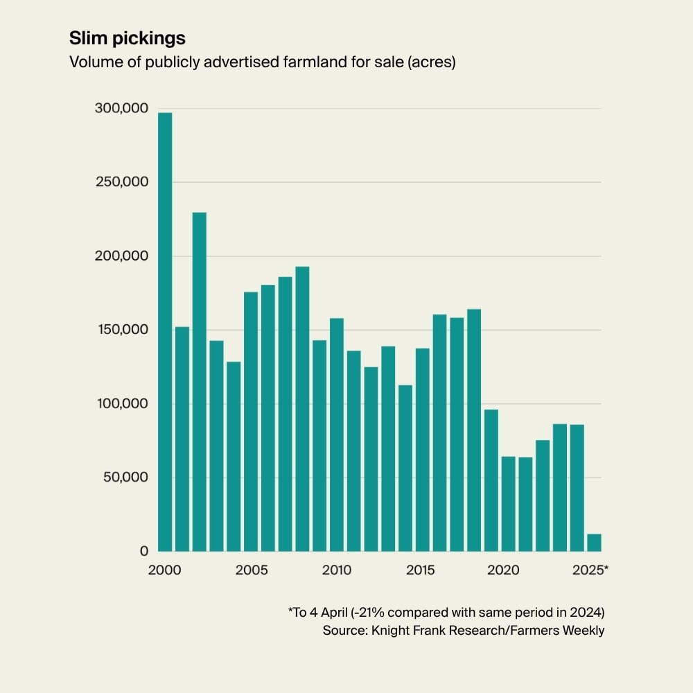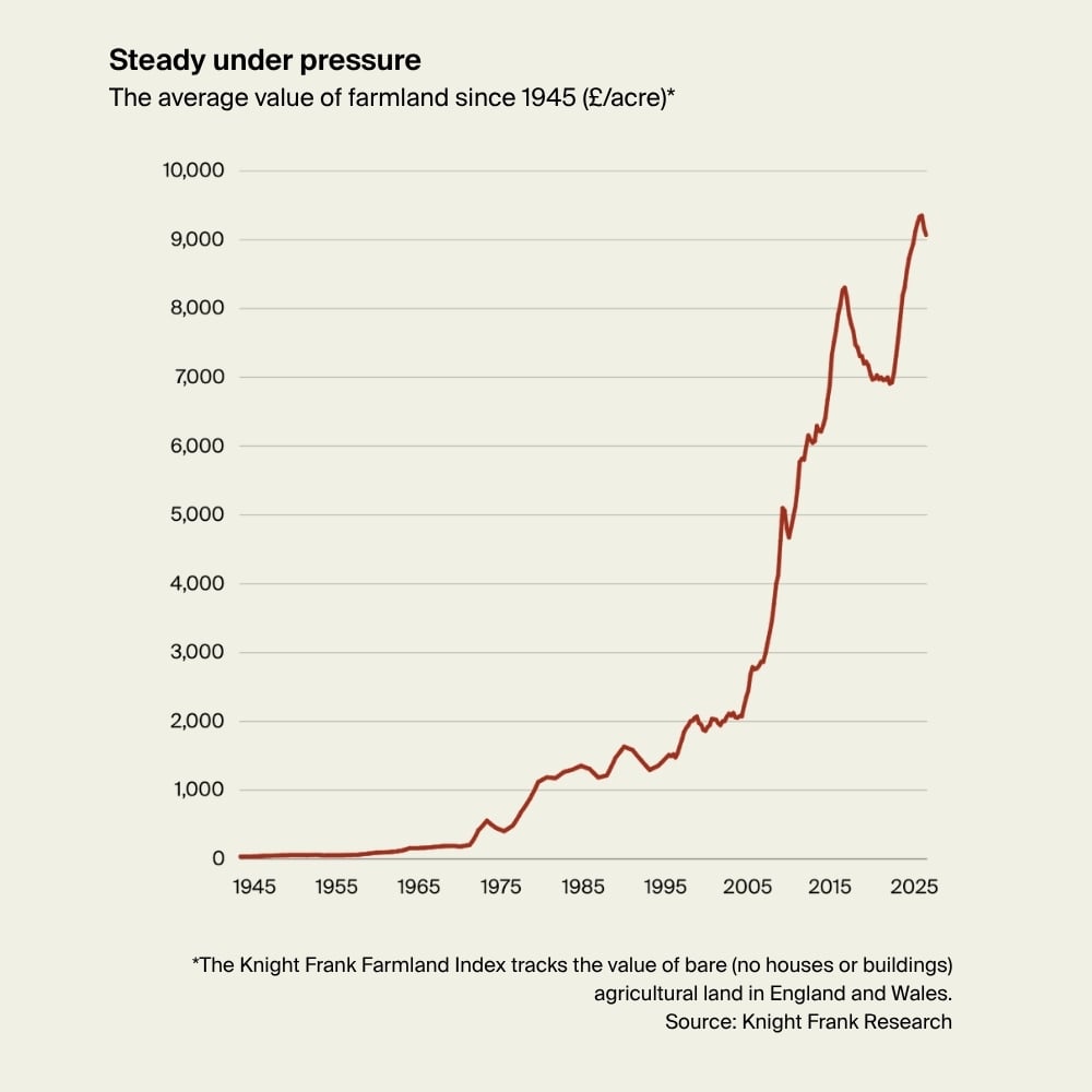 According to the Knight Frank Farmland Index, which tracks the value of bare agricultural land, prices dropped just 1% in the first three months of 2025, and by only 1.9% over a 12-month period.